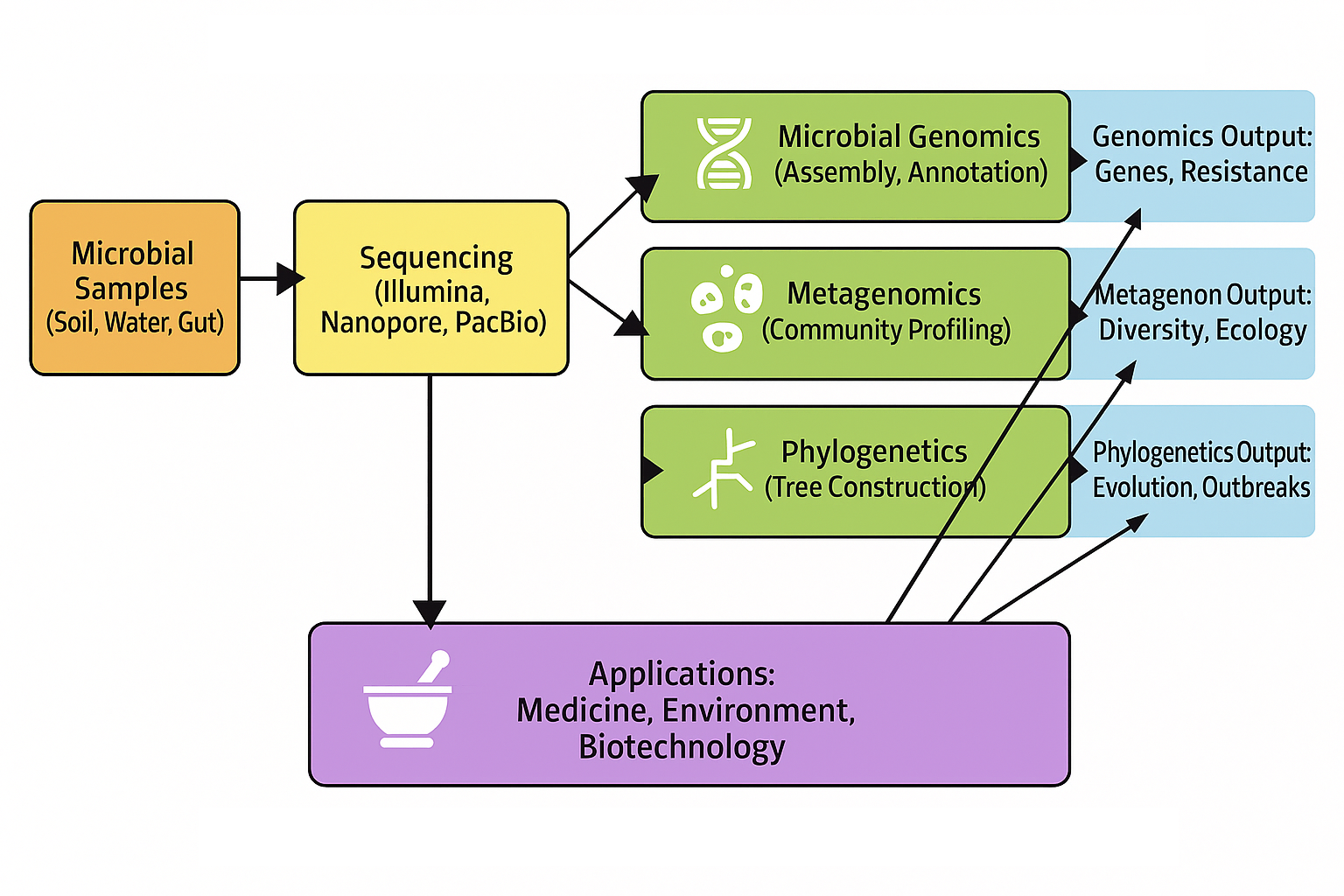 The primary objective of this study is to review and critically analyze the role of bioinformatics in microbiology, with a particular focus on microbial genomics, metagenomics, and phylogenetics. This work aims to examine how bioinformatics tools and computational techniques contribute to the analysis and interpretation of microbial genomes, emphasizing gene identification, annotation, and functional prediction. It further seeks to explore the significance of metagenomics in revealing the genetic diversity and functional potential of microbial communities, highlighting the bioinformatics platforms that enable large-scale environmental data analysis. Additionally, the study assesses the role of bioinformatics in phylogenetic research, particularly in reconstructing evolutionary relationships, tracing microbial adaptation, and understanding ecological interactions. Beyond these specific areas, the work discusses the broader applications of bioinformatics in medicine, agriculture, industry, and environmental management, underlining its transformative impact on contemporary biological research. Finally, the study identifies current challenges and limitations, while outlining future directions for advancing bioinformatics in microbiology through interdisciplinary collaboration and innovative computational strategies.