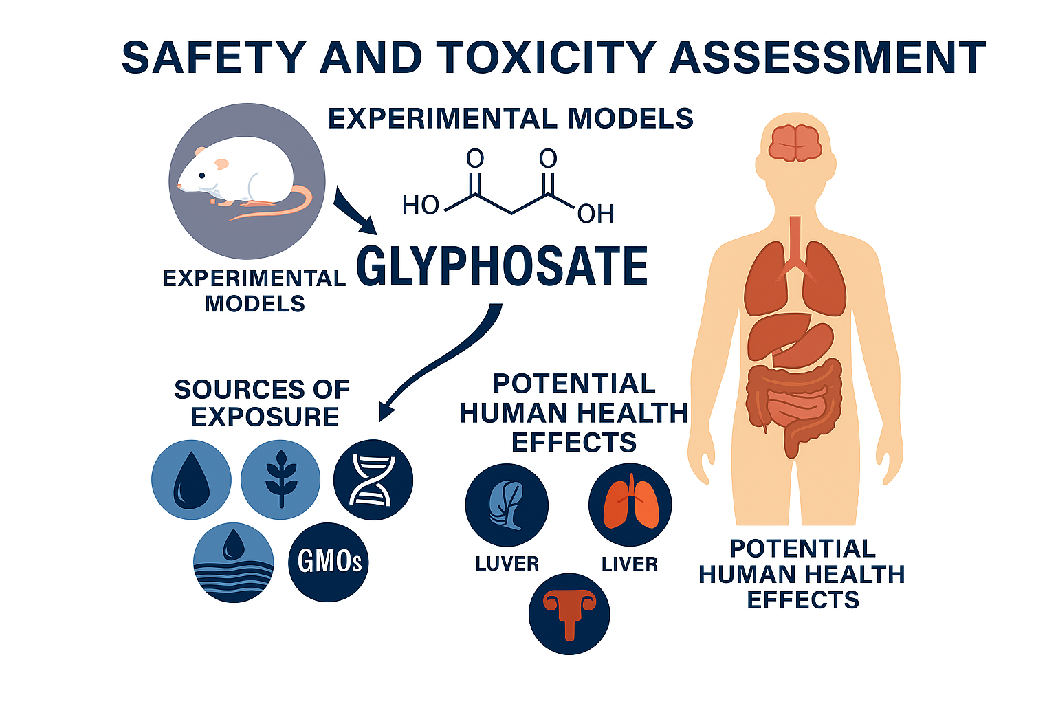 Figure 3: The potential sources of exposure to glyphosate and possible adverse effects in humans. Safety and Toxicity Assessment of GlyphosateāConceptual Pathway from Exposure to Potential Health Effects. This schematic summarizes the major components used in evaluating glyphosateās safety and toxicity. Center: the glyphosate molecule anchors the framework. Left (Experimental Models): icons depict in vivo animal studies and human cell-culture assays commonly used to characterize doseāresponse, mechanism of action, and hazard classification. Lower left (Sources of Exposure): representative pathways include contaminated water, agricultural application to crops, genetically engineered systems/GMOs, and environmental runoff, indicating routes by which glyphosate can enter human or ecological compartments. Right (Potential Human Health Effects): a human silhouette highlights organ systems frequently examined in risk assessmentsābrain (neurological), lungs (respiratory), liver (hepatic), gastrointestinal tract, and reproductive organs. Arrows denote the conceptual flow: external exposure ? internal dose ? biological response ? measurable health endpoints. (Courtesy of image from (Williams et al., 2016).