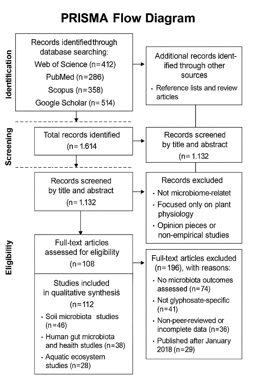 Glyphosate residues have also been detected in food products and human urine, raising concerns about chronic low-dose exposure (Mao et al., 2018). Although regulatory agencies consider these levels below harmful thresholds, the cumulative impact on gut microbial diversity remains uncertain, particularly given that most studies prior to 2018 focused on acute toxicity rather than microbiome-specific outcomes.