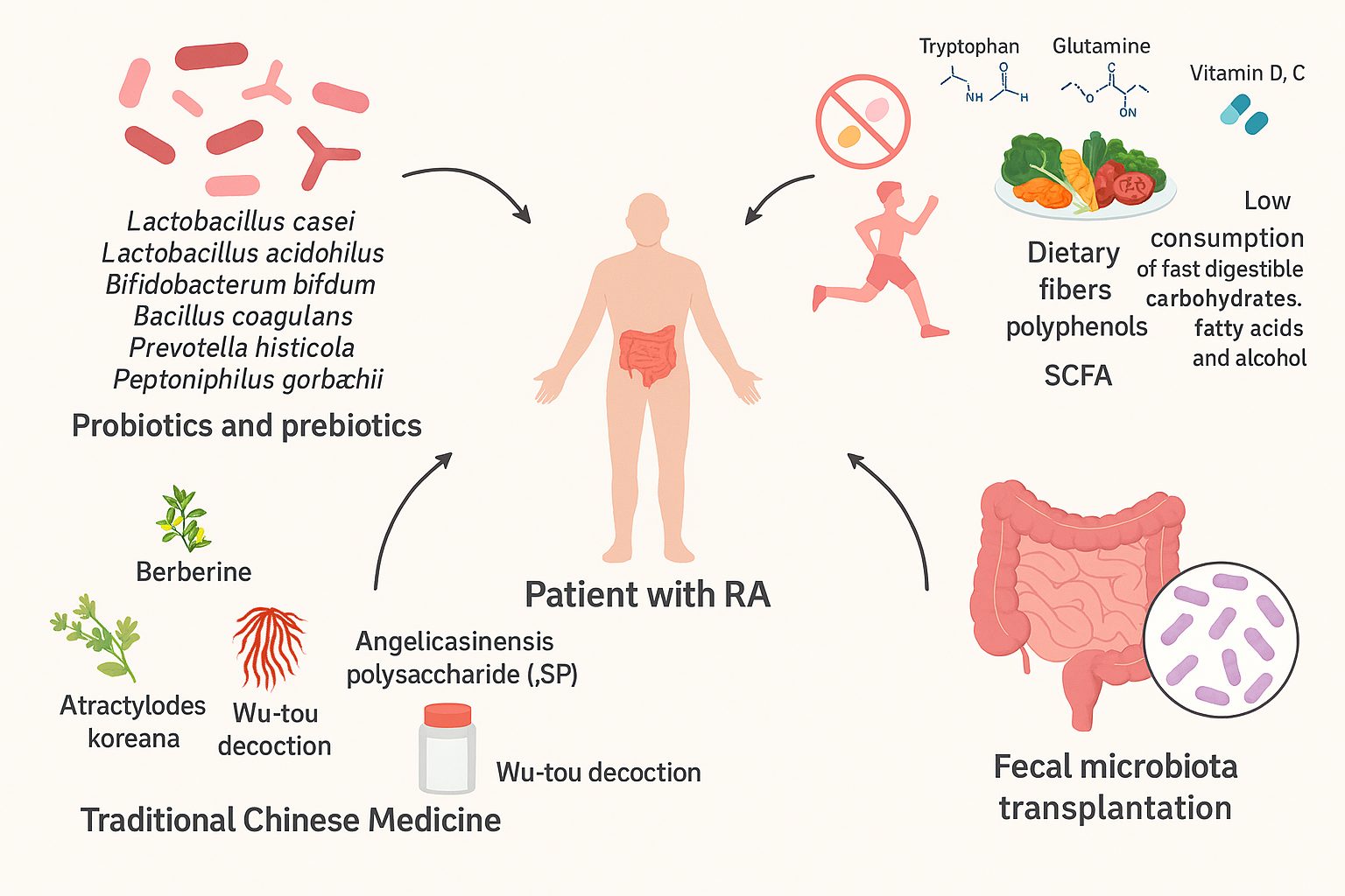 Figure 1: A Novel Strategy for Rheumatoid Arthritis Therapy. Gut Microbiota Interventions for Rheumatoid Arthritis (RA) to modulate gut microbiota in patients with RA. Key approaches include: Probiotics and Prebiotics: Specific strains such as Lactobacillus casei, Lactobacillus acidophilus, Bifidobacterium bifidum, Bacillus coagulans, Prevotella histicola, and Peptoniphilus gorbachii. Diet and Lifestyle: Incorporating dietary fibers, polyphenols, short-chain fatty acids (SCFA), essential amino acids (tryptophan, glutamine), vitamins D and C, and reducing fast-digestible carbohydrates, fatty acids, and alcohol. Traditional Chinese Medicine: Use of berberine, Atractylodes koreana, Angelica sinensis polysaccharide (ASP), and Wu-tou decoction. Fecal Microbiota Transplantation: Restoring gut microbial balance to improve systemic health. (courtesy of image from Zhang et al., (2015)
