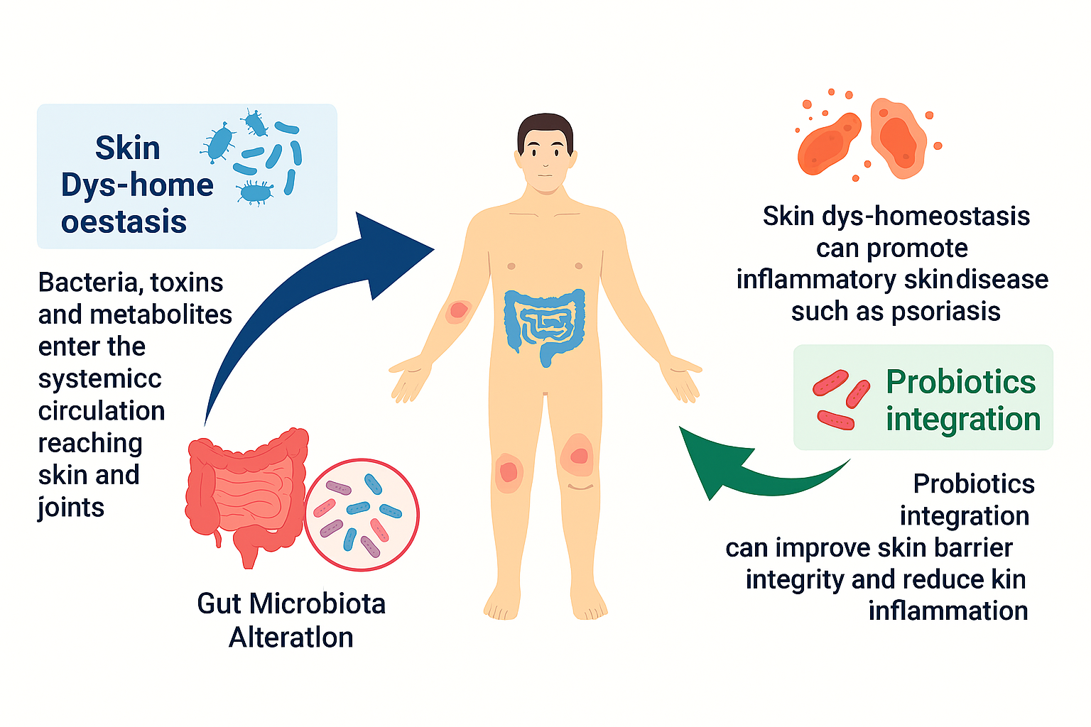 Figure 2. The Skin Microbiome and its Role in Psoriasis. Gut-Skin Axis and Inflammation to demonstrates the relationship between gut microbiota and skin health. Gut Microbiota Alteration: Disruption in gut microbial composition allows bacteria, toxins, and metabolites to enter systemic circulation, affecting skin and joints. Skin Dys-homeostasis: Imbalance in skin microbiota can promote inflammatory skin diseases such as psoriasis. Probiotics Integration: Introducing beneficial microbes can enhance skin barrier integrity and reduce skin inflammation. (Courtesy of image from Grice, E. A., & Segre, J. A. (2011)