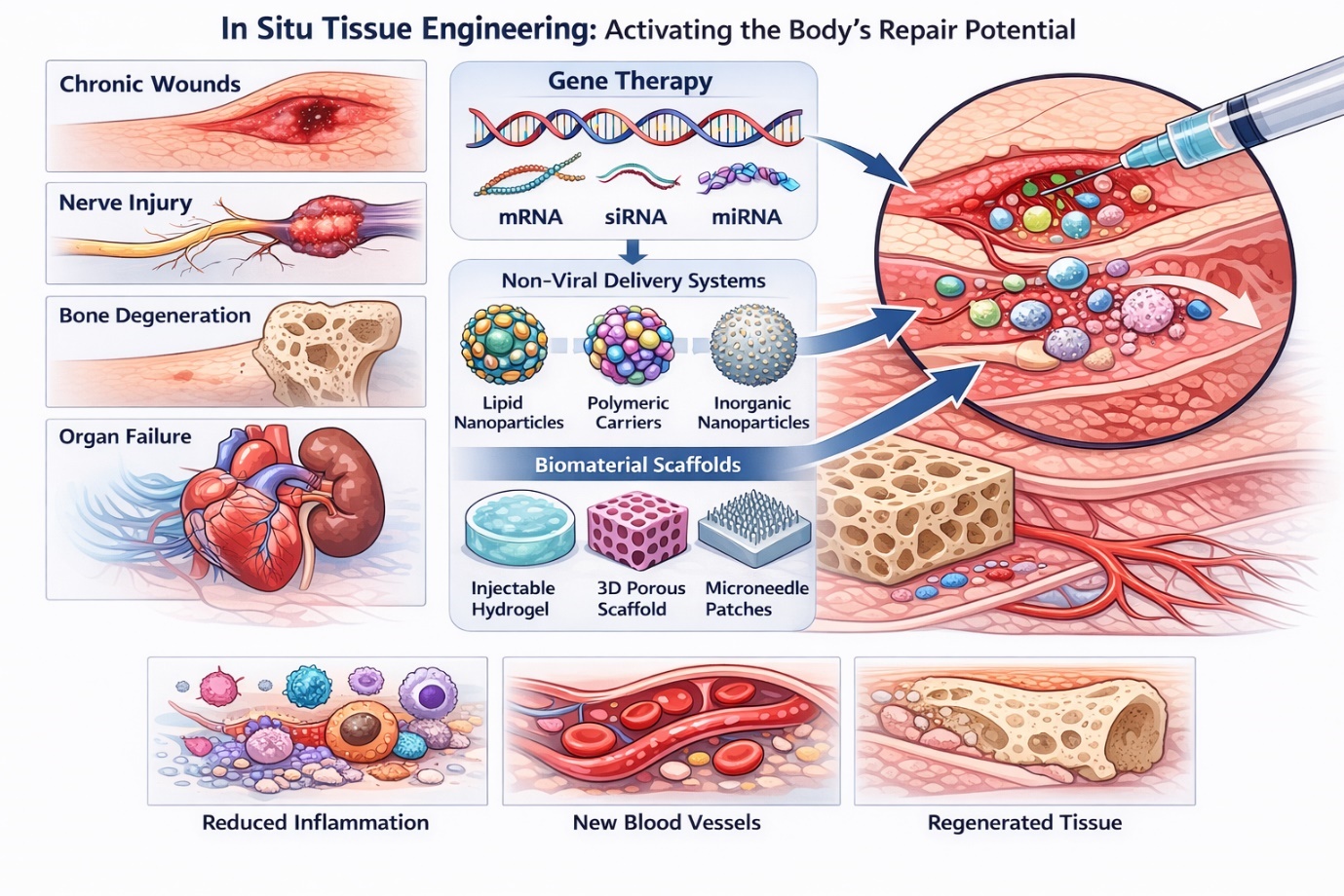 Regenerative medicine has steadily shifted from an aspirational concept toward a practical framework for addressing tissue damage that cannot be resolved through conventional clinical interventions. Chronic wounds, degenerative musculoskeletal disorders, nerve injuries, and organ failure frequently overwhelm the body’s intrinsic repair capacity, leaving limited therapeutic options. In this context, in situ tissue engineering has emerged as a compelling strategy—not by replacing damaged tissue outright, but by activating endogenous repair mechanisms directly at the site of injury. Rather than introducing fully formed tissues or large numbers of exogenous cells, this approach seeks to guide cellular behavior where regeneration is needed most (Malek-Khatabi et al., 2020; Moncal et al., 2022).