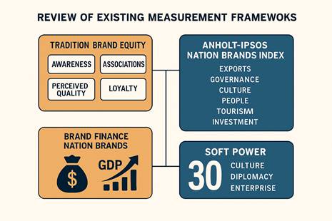 The traditional brand equity theories created within the marketing field have greatly influenced the measurement of national brand equity. Brand equity is conceptualized as a multifaceted entity made up of brand awareness, brand associations, perceived quality, and brand loyalty in seminal works (Aaker, 1991) and (Keller, 1993). These factors have been adapted to the context of nation branding since they have demonstrated efficacy in evaluating consumer-based brand value. However, nations function inside intricate socio-political, cultural, and diplomatic ecosystems, in contrast to commercial brands.