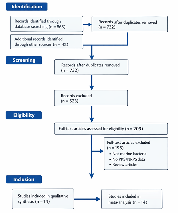 The statistical analysis conducted in this systematic review and meta-analysis was designed to quantitatively synthesize findings on the prevalence of biosynthetic gene clusters (BGCs), particularly Polyketide Synthase (PKS) and Nonribosomal Peptide Synthetase (NRPS) domains, across diverse marine microbial taxa. Data from the included studies were extracted and harmonized to calculate effect sizes representing the proportion of each taxon’s genome or metagenome encoding these biosynthetic domains. Heterogeneity across studies was assessed using the I² statistic, and pooled effect sizes were estimated using random-effects models, consistent with recommendations for meta-analyses with diverse study designs and ecological contexts.