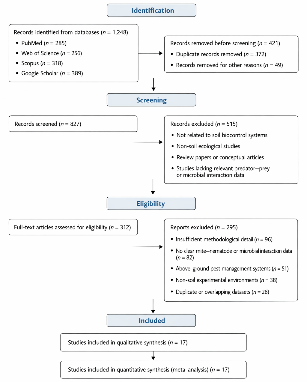 Ecological heterogeneity contributes to observed asymmetry. Soil aggregate size, organic matter content, and moisture influence both nematode prey accessibility and predator foraging efficiency (Li et al., 2023; Rueda-Ramírez et al., 2023). Additionally, microbial predation by myxobacteria and nematode-trapping fungi such as Arthrobotrys oligospora modulates the soil microfauna structure, indirectly affecting predator efficiency (Liang et al., 2016; Wang et al., 2020). Thus, slight funnel asymmetry may reflect true ecological variance rather than solely publication bias.