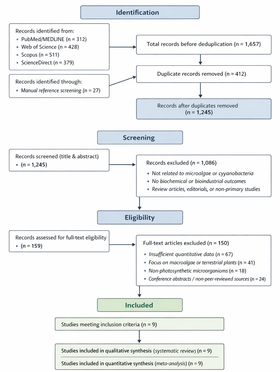 The systematic synthesis and meta-analysis revealed substantial quantitative variability in biochemical composition and applied performance among microalgae and cyanobacteria, reflecting pronounced taxonomic, physiological, and technological heterogeneity (Metting, 1996; Ruggiero et al., 2015). Descriptive statistics summarized in Table 1 show wide ranges in reported protein, lipid, pigment, and application-specific performance metrics across included studies (Pulz & Gross, 2004). This dispersion underscores the importance of adopting a random-effects framework, as the assumption of a single common effect size across studies is biologically implausible for photosynthetic microorganisms that span multiple evolutionary lineages and cultivation strategies (Richmond, 2004).