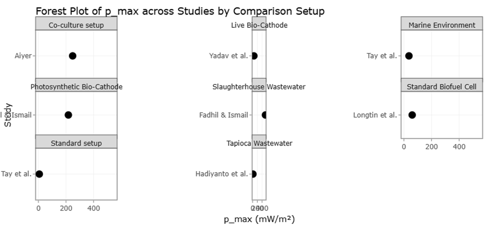 Figure 2. Meta-Analytical Comparison of Maximum Power Output. Across Microalgae-Assisted Systems. This forest plot summarizing individual study effect sizes and pooled estimates of maximum power output from microalgae-assisted microbial fuel cell configurations under different experimental setups. The wide confidence intervals and elevated heterogeneity reflect substantial biological and system-level variability among included studies.
