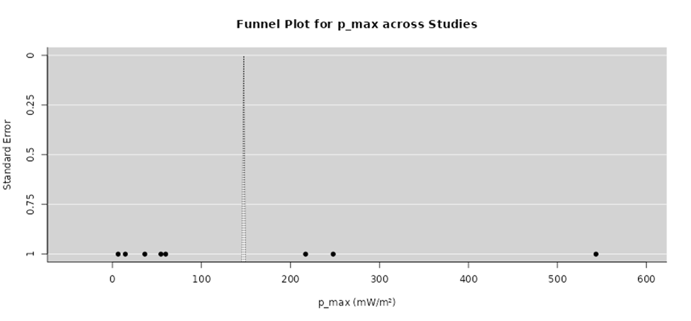 Figure 3. Funnel Plot Assessing Study Precision and Variability in Maximum Power Output. This funnel plot illustrating the distribution of effect sizes for maximum power output relative to study precision across included investigations. The overall pattern suggests moderate asymmetry, consistent with methodological heterogeneity and small-study effects rather than pronounced publication bias.