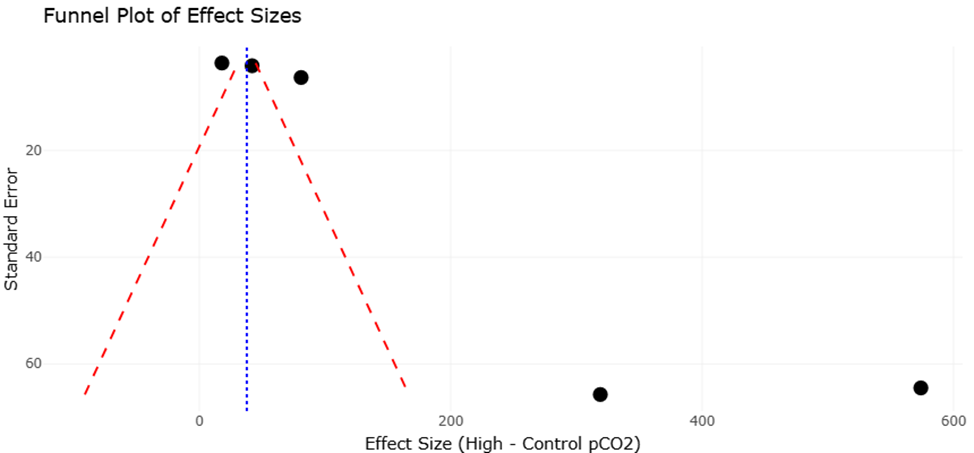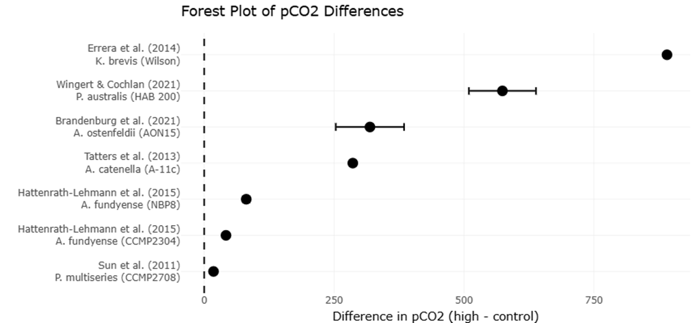 Meta-analyses of physiological responses to elevated pCO2 underscore the nuanced effects of ocean acidification on microalgal growth and toxicity. Across multiple studies, species such as Alexandrium fundyense, A. catenella, and Prorocentrum multiseries demonstrated enhanced growth under elevated CO2, whereas Pseudo-nitzschia australis showed growth inhibition at high pCO2 (Hattenrath-Lehmann et al., 2015; Tatters et al., 2013; Wingert & Cochlan, 2021). Toxin production followed similarly variable trends: several Alexandrium strains exhibited increased saxitoxin synthesis under acidified conditions, while other species like A. ostenfeldii and A. tamarense showed decreased toxicity (Brandenburg et al., 2021; Van de Waal et al., 2014). These results highlight the importance of species-specific assessments when predicting ecological impacts of climate change on harmful algal blooms, emphasizing the value of systematic review and meta-analytic approaches for synthesizing complex datasets.