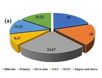 performances of crossbred and indigenous dairy cows under smallholder dairy farming conditions at Sharsha Thana in Jessore and reported that the percentage of the illiterate, primary level, in class six, SSC level, HSC level, degree, and above the farmers was 15, 17, 25, 11, 20, and 12, respectively. Agriculture was the main occupation of farmers (45%), followed by business (38%), service holders (15%), and others are 2%, respectively.