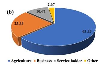 In this study, 150 dairy cow owners were selected, and information about their educational status and main occupation was collected through direct interviews. The obtained results are presented in Figure 1. It was noticed that the highest responders were in classes six to nine (24.67%), followed by illiterate (20.0%), primary level (18.0%), degree and above (15.33%), H.S.C. level (13.33%), and S.S.C. level (08.76%) (Figure 1a). On the other hand, agriculture was the main occupation of farmers (63.33%), followed by business (23.33%), service holder (10.67%), and others (2.67%) (Figure 1b). The collected information regarding the occupation of farmers agrees with Ali (1998), who conducted an experiment in Gaibandha district and observed that agriculture was the main occupation and business was the second main occupation of dairy cow raisers. Rahman (1996) conducted another study in Dhaka Metropolitan City and found that 19 percent of farmers had taken dairying as a main business and 81 percent had taken it as a side business.
