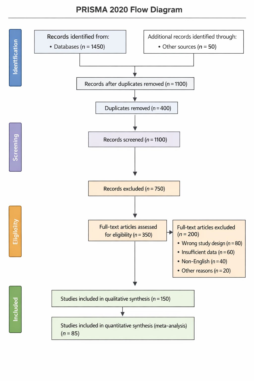 The initial overview of the included studies highlights the breadth and diversity of the dataset, as summarized in Table 1. The table demonstrates variation in sample size, study design, outcome measures, and analytical approaches, which justified the use of a random-effects model in subsequent meta-analyses. This diversity is further contextualized by the study selection process illustrated in Figure 2, which shows a systematic reduction from a broad initial search yield to a refined set of eligible studies. The attrition at each screening stage reflects strict adherence to inclusion criteria, ensuring that only methodologically relevant studies contributed to the quantitative synthesis. The structured progression depicted in Figure 2 reinforces the transparency of the selection process and provides a foundation for interpreting downstream statistical findings. By documenting exclusions at each stage, the figure supports confidence that the final dataset is both comprehensive and appropriately curated, minimizing selection bias within the constraints of the available literature.The primary quantitative findings are summarized in Table 2, which presents pooled effect estimates derived from the included studies. Across the analyzed outcomes, the aggregated effect sizes demonstrate consistent directional trends, indicating that the observed effects are not isolated artifacts of individual studies but rather reflect a broader pattern across the literature. The magnitude of the pooled estimates suggests biologically and practically meaningful effects, even when accounting for inter-study variability. Forest plot visualizations in Figure 2 provide a more granular perspective on these pooled outcomes. Individual study estimates show dispersion around the combined effect size, yet the majority align directionally with the overall estimate. This visual convergence reinforces the statistical robustness of the pooled results while simultaneously illustrating the natural variability inherent in multi-study synthesis. Importantly, confidence intervals for several studies overlap with the pooled estimate, suggesting coherence among findings despite differences in study-level methodologies.