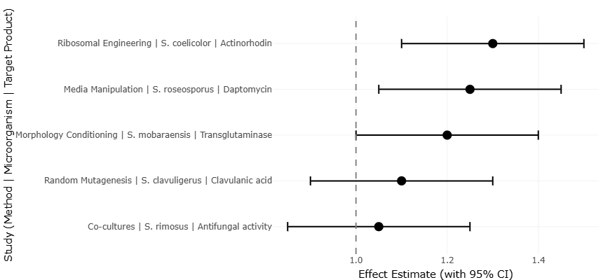 Figure 2. Forest Plot of Pooled Effect Sizes for Secondary Metabolite Enhancement Strategies. This plot visualizes individual and pooled effect sizes for interventions aimed at enhancing metabolite production. It highlights inter-study variability, confidence intervals, and the overall direction and magnitude of effects.