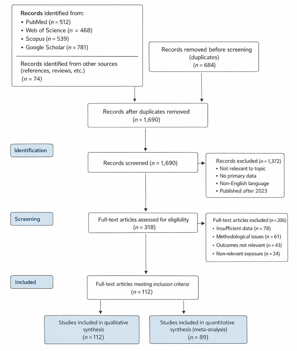 The present study integrated a meta-analysis and systematic review to evaluate the combined effects of environmental stressors—including light exposure, trace metals, dietary patterns, and bioplastic degradation—on microbial systems and human health outcomes. Data were pooled from diverse experimental settings, including aquatic microorganisms, SHIME® gut models, human observational studies, and composting trials of bioplastics. Statistical analyses were conducted to quantify effect sizes, assess heterogeneity, and explore potential interactions between stressors and biological outcomes.