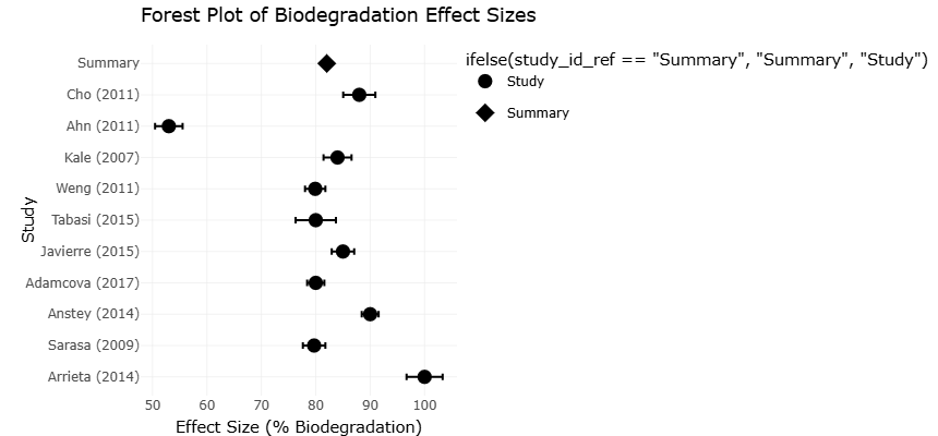 Figure 2. Meta-Analysis of Bioplastic Biodegradability under Aerobic Composting Conditions. This forest plot displays pooled biodegradation effect sizes for different bioplastic materials under aerobic composting conditions. The figure highlights variability among polymer types and experimental settings while presenting the overall random-effects estimate.