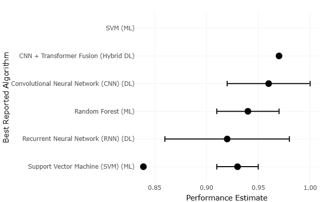 In light of these challenges, the present study adopts a systematic review and meta-analytic approach to examine AI and ML applications in biomedical signal analysis across multiple domains. By synthesizing evidence from EEG, ECG, EMG, and respiratory signal studies, this review seeks to move beyond isolated performance metrics and toward a more integrated understanding of methodological trends, validation practices, and clinical applicability. Quantitative synthesis methods, informed by established principles of research integration, enable the comparison of effect sizes and performance outcomes across heterogeneous studies (Lau et al., 1997). At the same time, qualitative assessment provides context—highlighting where methodological rigor is strong and where it may be, perhaps, less certain.