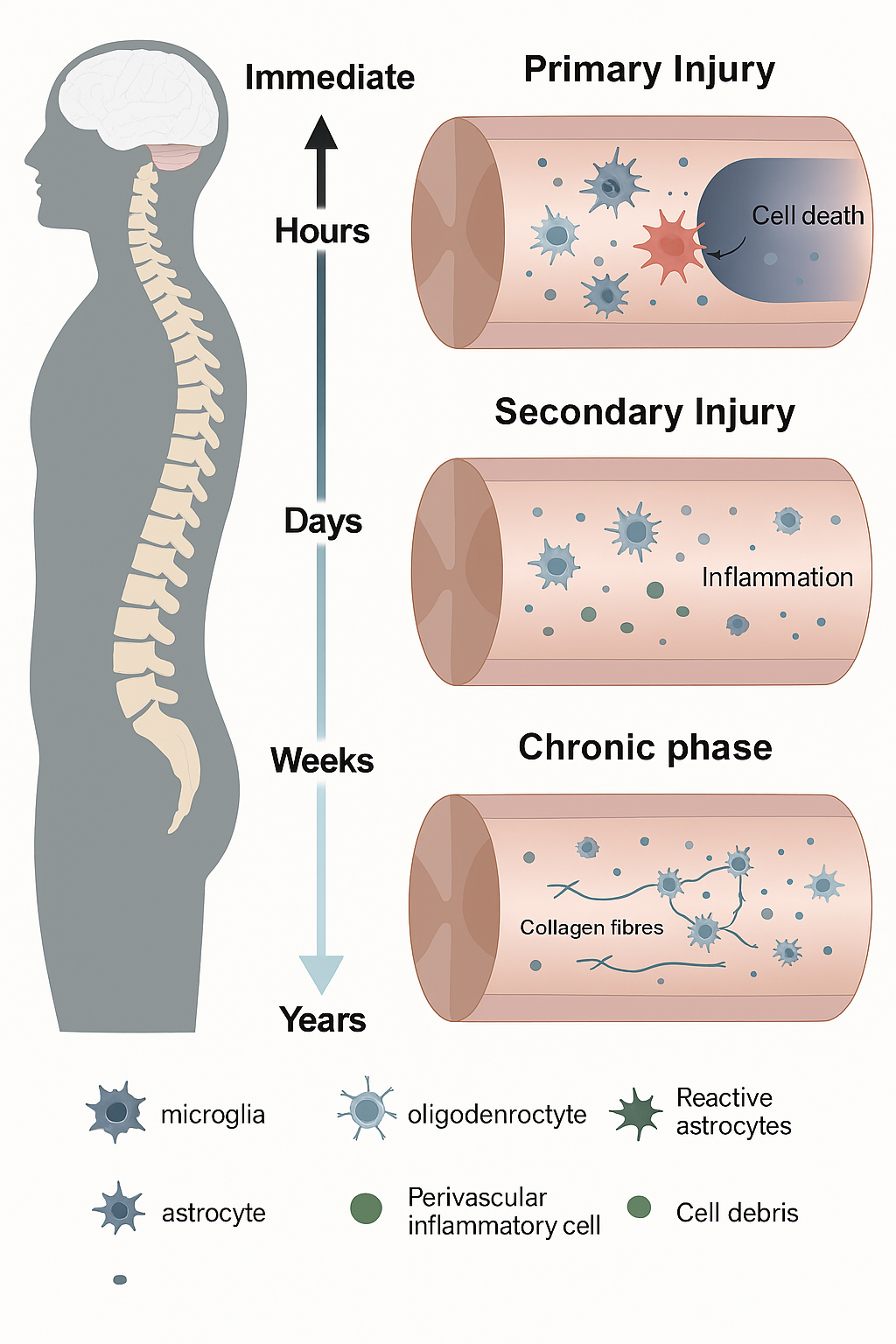 Spinal cord injury (SCI) is a catastrophic condition that leads to profound and often irreversible physical, neurological, and psychological impairments. Individuals affected by SCI face partial or complete loss of motor function, sensory perception, and autonomic control, which drastically diminishes quality of life and imposes substantial socioeconomic burdens (Smith & Taylor, 2015). Globally, the incidence of SCI is estimated to range from 250,000 to 500,000 cases annually, with traumaāsuch as vehicular accidents, falls, and sports injuriesābeing the primary cause (Smith et al., 2015). The complex pathophysiology of SCI involves an initial mechanical injury followed by a cascade of secondary processes including inflammation, oxidative stress, excitotoxicity, and apoptosis of neural cells, which further exacerbate tissue damage (Courtine & Sofroniew, 2019). These multifaceted challenges make SCI a condition with limited therapeutic options, as conventional treatments mainly focus on symptomatic management, rehabilitation, and supportive care rather than true neurological repair (Jones & Carter, 2016).