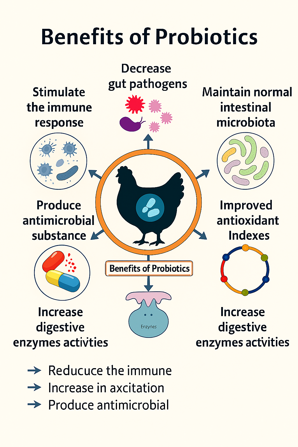 One of the most promising solutions lies in probiotics—live microorganisms that, when administered in adequate amounts, confer health benefits to the host (Fuller, 1989). In poultry, probiotics are emerging as natural allies that can restore microbial balance, improve digestion, and strengthen immune defenses without the risks associated with antibiotics. These microorganisms, often belonging to genera such as Lactobacillus, Bifidobacterium, Enterococcus, and Bacillus, help create a stable gut ecosystem that supports both health and productivity (Bai et al., 2013). Unlike antibiotics, probiotics do not simply eliminate harmful bacteria; they work holistically by promoting beneficial microbes, producing antimicrobial substances, and reinforcing the structural integrity of the gut lining (Siwek et al., 2018).