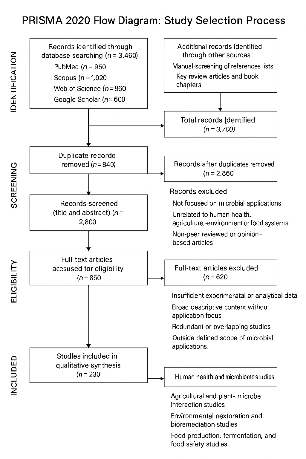 Figure 1. PRISMA 2020 flow diagram illustrating the identification, screening, eligibility assessment, and inclusion of studies evaluating microbial roles and applications in human health, agriculture, environmental restoration, and food production.