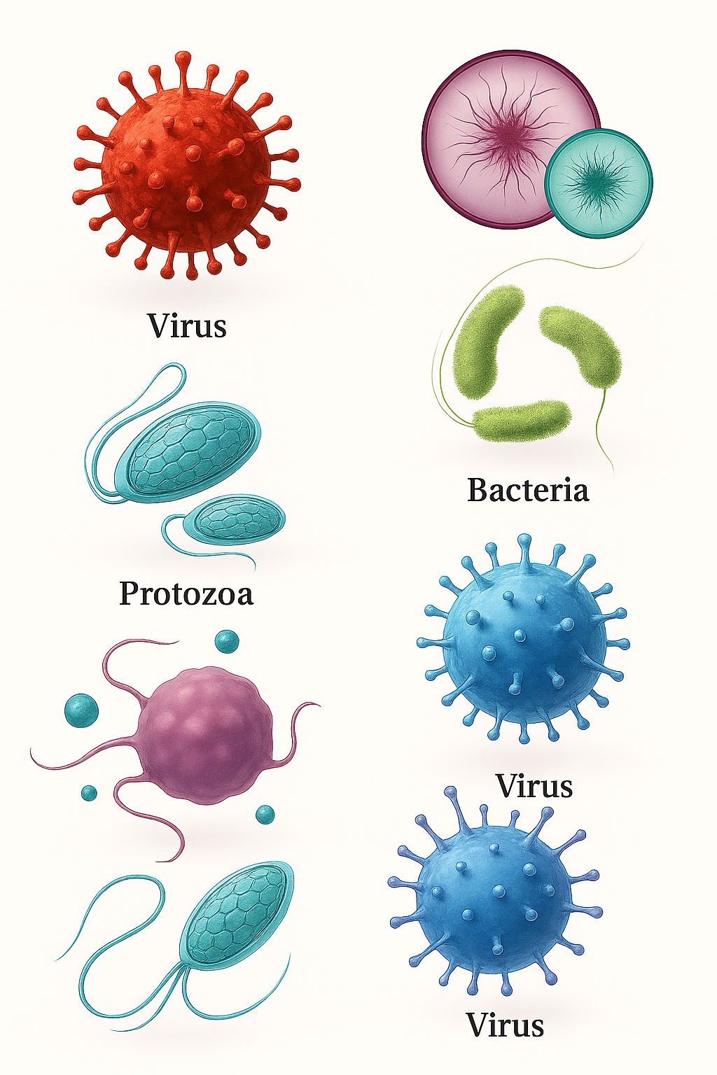Figure 2. Morphological diversity of microorganisms. Viruses (red and blue spherical forms), bacteria (green rod-shaped), and protozoa (pink and teal forms) are illustrated to represent structural differences relevant to microbiological studies.