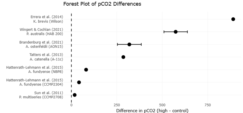 Meta-analyses of physiological responses to elevated pCO2 underscore the nuanced effects of ocean acidification on microalgal growth and toxicity. Across multiple studies, species such as Alexandrium fundyense, A. catenella, and Prorocentrum multiseries demonstrated enhanced growth under elevated CO2, whereas Pseudo-nitzschia australis showed growth inhibition at high pCO2 (Hattenrath-Lehmann et al., 2015; Tatters et al., 2013; Wingert & Cochlan, 2021). Toxin production followed similarly variable trends: several Alexandrium strains exhibited increased saxitoxin synthesis under acidified conditions, while other species like A. ostenfeldii and A. tamarense showed decreased toxicity (Brandenburg et al., 2021; Van de Waal et al., 2014). These results highlight the importance of species-specific assessments when predicting ecological impacts of climate change on harmful algal blooms, emphasizing the value of systematic review and meta-analytic approaches for synthesizing complex datasets.