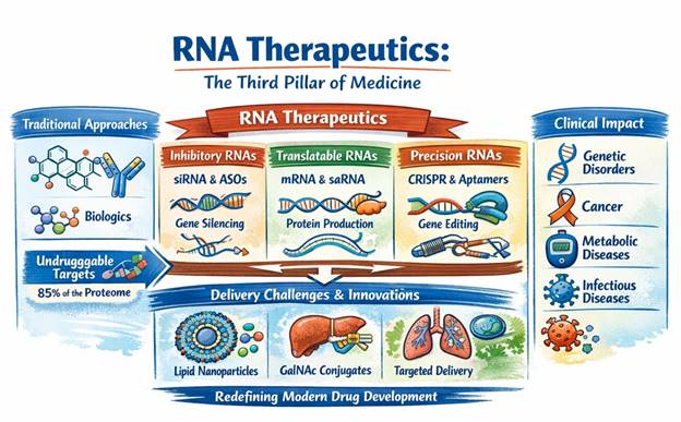 Over the past decade, RNA-based therapeutics have moved from theoretical promise to clinical reality, redefining the landscape of modern drug development. Increasingly described as the “third pillar” of therapeutics—alongside small molecules and biologics—RNA medicines represent a conceptual shift in how disease is approached and treated (Al-Hamdani et al., 2023; Shahid, 2025). Traditional pharmacology largely depends on modulating protein function through binding to accessible active sites. Yet, it is estimated that nearly 85% of the human proteome lacks such druggable pockets, leaving many genetic drivers of disease beyond the reach of conventional approaches (Jones et al., 2024; Paunovska et al., 2022). RNA-based platforms overcome this limitation by acting upstream of protein synthesis, enabling direct modulation of gene expression at the transcript level. In principle, once a pathogenic gene sequence is identified, it becomes a potential therapeutic target.