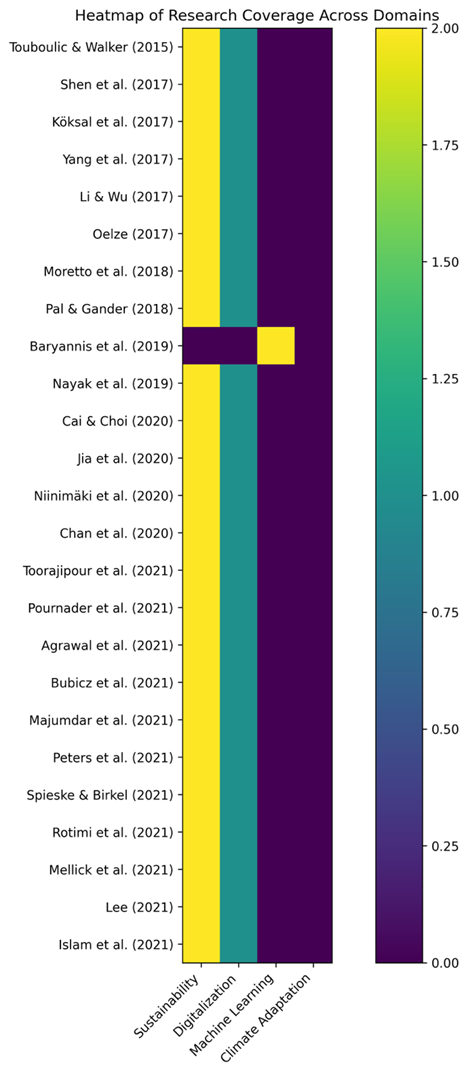 Figure 2. Heatmap of research coverage across sustainability, digitalization, machine learning, and climate adaptation domains in apparel supply chain literature (2015–2021). This heatmap illustrates the relative intensity of research activity across four key domains: sustainability, digitalization, machine learning, and climate adaptation. Each study is mapped based on its thematic emphasis, revealing strong clustering around sustainability and digitalization, moderate representation of circular economy concepts, and limited engagement with machine learning and climate-adaptive supply chain strategies.