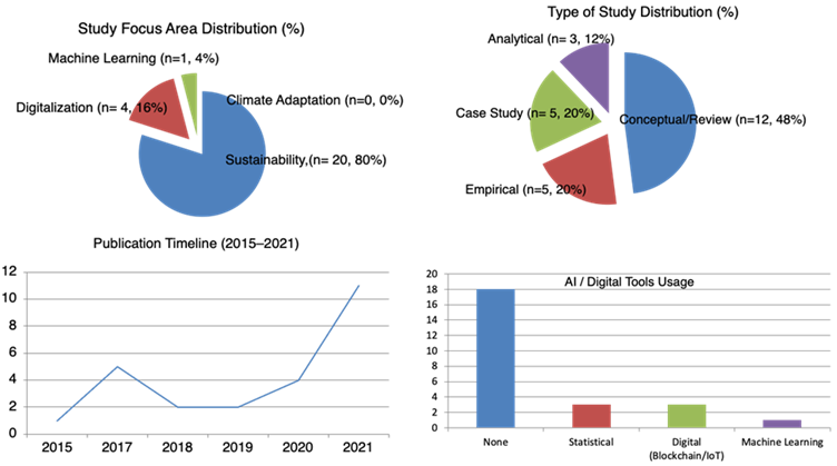 Figure 1. Graphical analysis of the included studies (n = 25). This figure presents a visual distribution of the reviewed studies across major research themes, illustrating the dominance of sustainability-focused research relative to digitalization, machine learning, and climate adaptation. The representation highlights the imbalance in scholarly attention, with sustainability and circular economy topics receiving substantial coverage, while data-driven and adaptive approaches remain comparatively underrepresented.