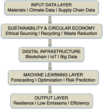 Figure 3. Conceptual framework of machine learning–enabled climate-adaptive sustainable apparel supply chains This figure presents the proposed multi-layered conceptual framework integrating sustainability practices, circular economy principles, digital infrastructure, and machine learning capabilities within apparel supply chains. The framework illustrates the flow from data inputs through analytical processing to adaptive decision-making outcomes, emphasizing the transition from static, compliance-based systems to predictive, resilient, and climate-responsive supply chain architectures.